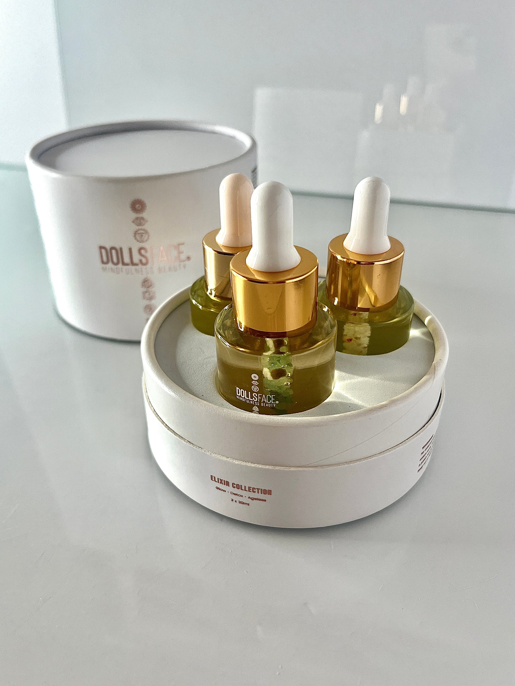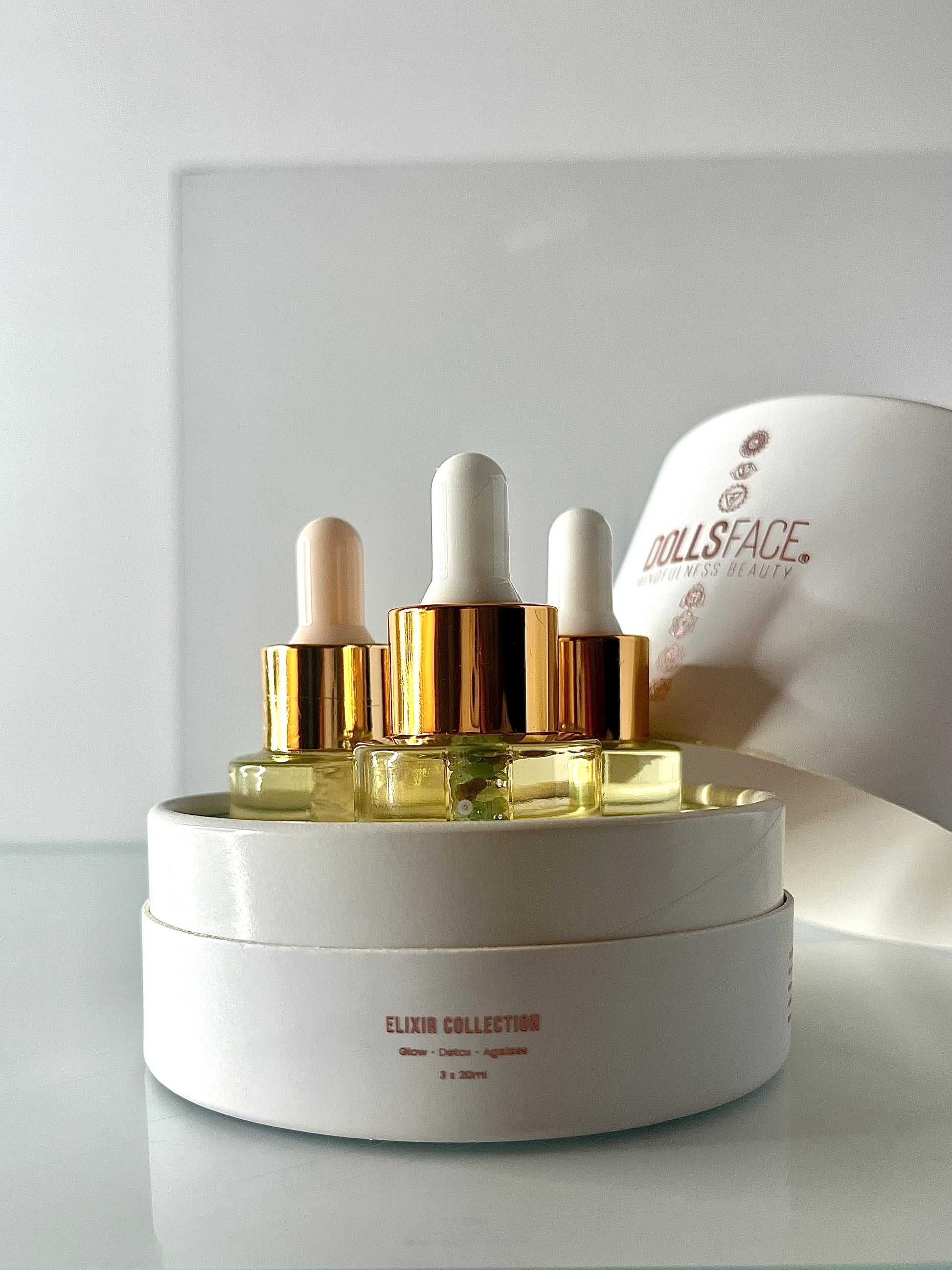 The heart of DOLLSFACE® — a curated trilogy of signature Face + Neck ELIXIRS designed to be used intuitively, individually or together as a complete ritual.